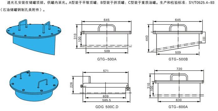 透光分類:A型裝于平錐項(xiàng)罐,B型裝于拱項(xiàng)油罐,C型裝于重質(zhì)油罐,D非標(biāo)定做。