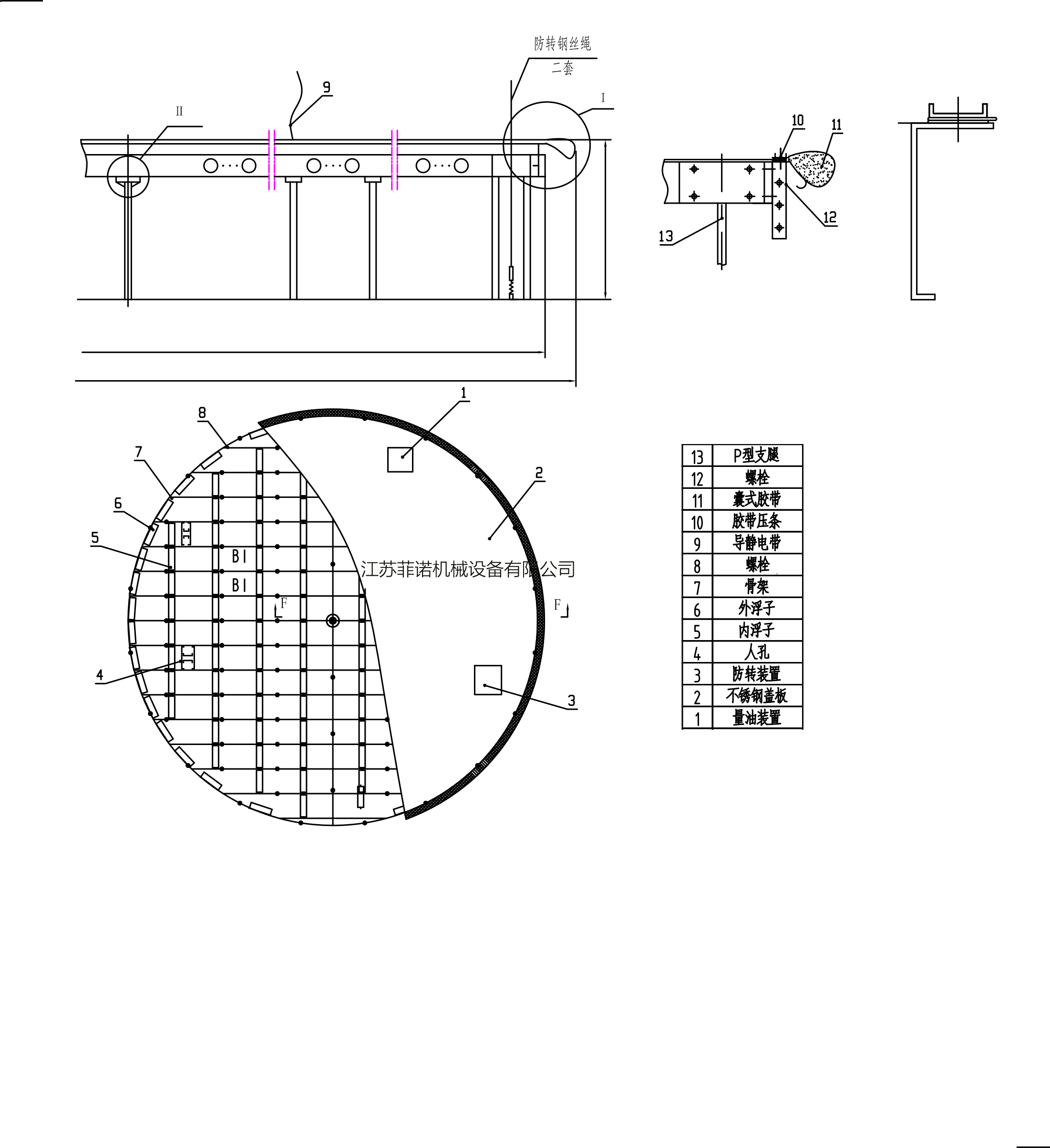 組裝式不銹鋼內浮盤采用了井字形結構。即浮盤的骨架成井字形;所用材料均為不銹鋼材質,增加浮盤的整體結構強度,相應延長了浮盤的使用壽命。